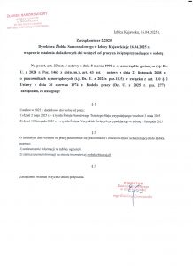 Zarządzenie nr 2/2025 Dyrektora ŻŁobka Samorządowego w Izbicy Kujawksiej w sprawie dodatkowych dni wolnych od pracy za święto przypadające w sobotę.