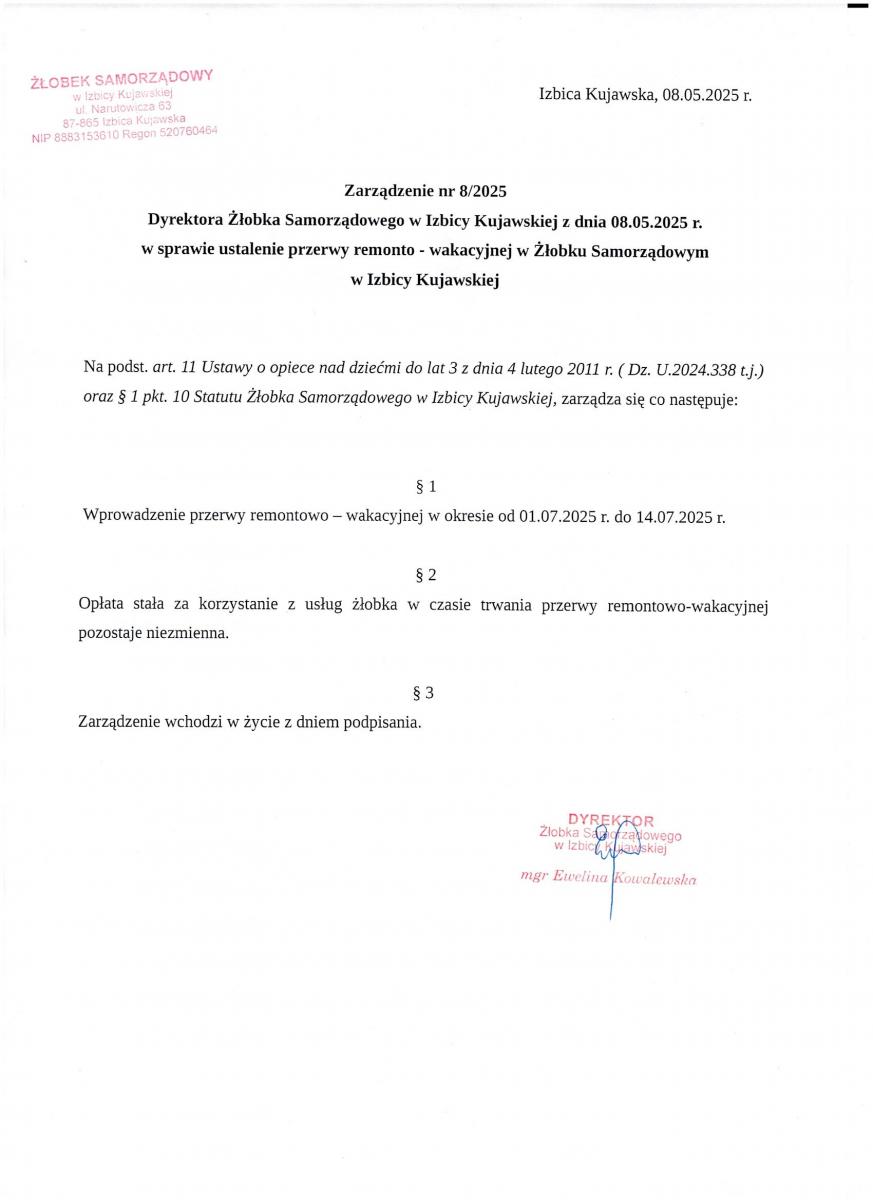 3) Zarządzenie Dyrektora Żłobka Samorządowego w Izbicy Kujawskiej w sprawie ustalenia przerwy wakacyjnej w Żłobku Samorządowym w Izbicy Kujawskiej